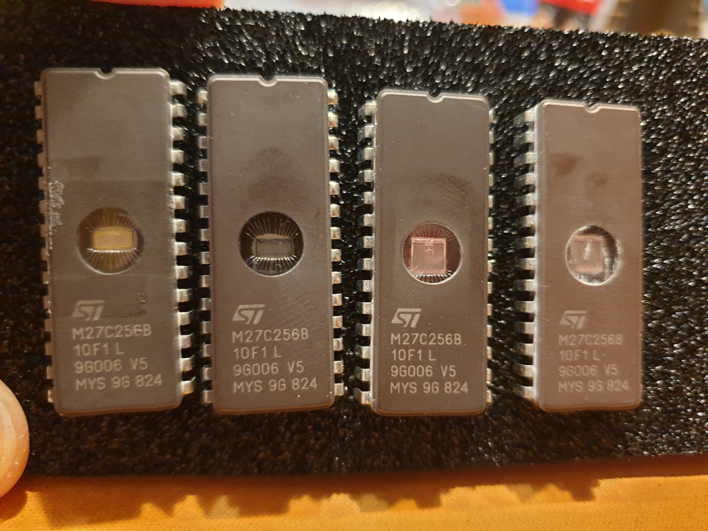 Die EPROMs wurden als gebraucht verkauft. Das sieht man auch etwas an den PINs und dem Chip-Gehäuse. Dafür zum Spotpreis von 3 US$. Daher beschwere ich mich nicht.