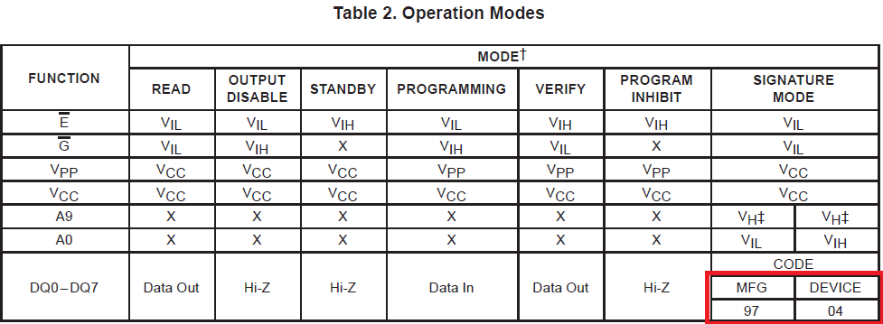 Also in der Software dieses Modell ausgewählt - Fehlermeldung falsche Chip-ID. Die ID lautet 97 04. Die ST M27C256B haben aber die ID 20 8D. Nach etwas Recherche fand ich dann heraus, dass die Chip ID 97 04 für die TI TMS27C256 steht.