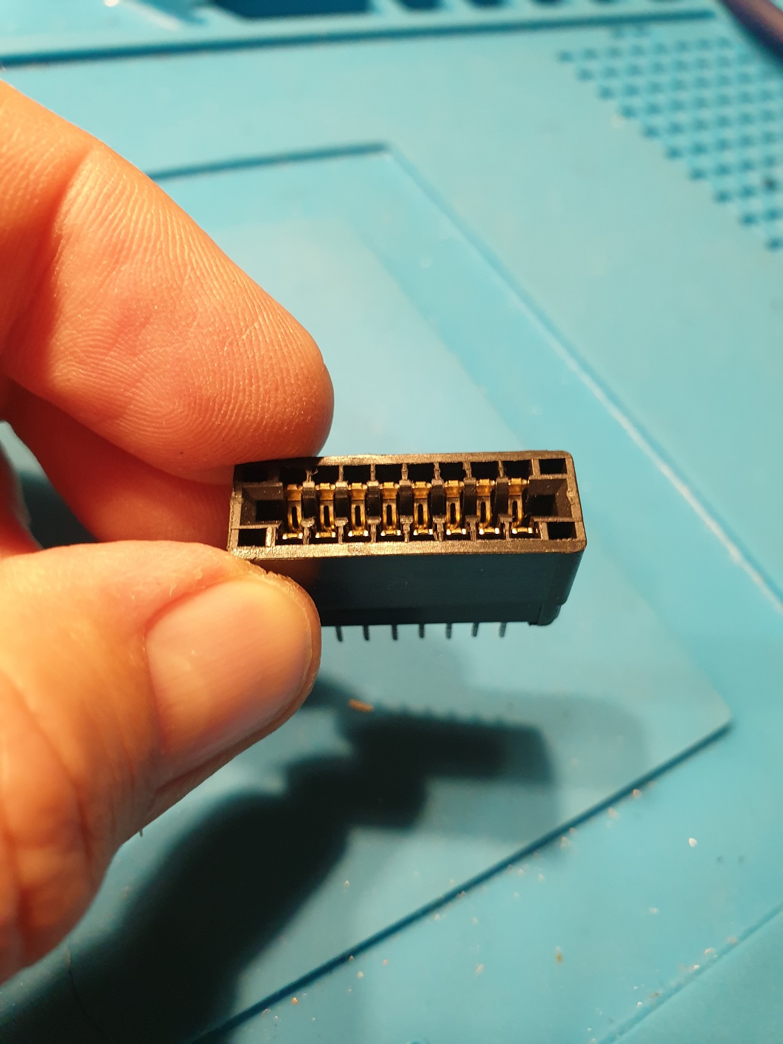 Dann verlöte ich die Pins der beiden Platinenstecker 1:1. Das Resultat ist etwas breiter als der Original Verbindungsstecker, aber funktioniert. Die freiliegenden verlöteten Pins habe ich mit Isolierband umwickelt.