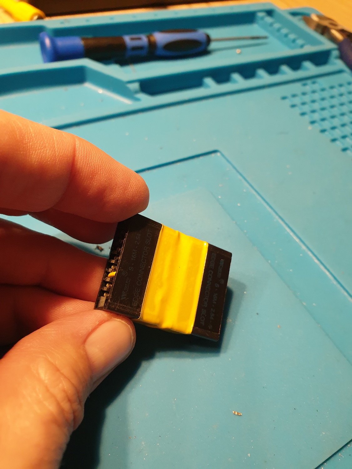 Ich habe zwei Platinenstecker zerstört, bis ich die geeignete Methode gefunden habe, damit die Platine des Buses auch über die Breite des Platinensteckers hinaus passt.