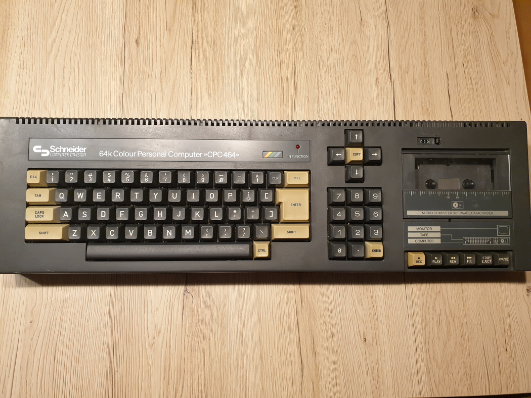 Ein Schneider CPC464. Dieser ist baugleich mit dem Amstrad CPC464, jedoch besaß er keine so bunte Tastatur wie der Amstrad CPC.
