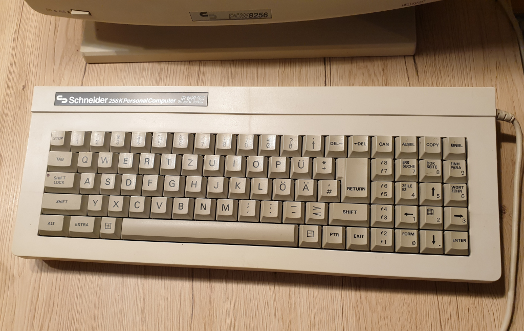 Das eingebaute Diskettenlaufwerk war das sehr seltene 3"-Format - was typisch für Amstrad war. Wie bei den Laufwerken vom CPC haben die Joyce das Problem mit ausgeleierten Antriebsriemen, der öfters mal gewechselt werden muß. Der Drucker ist ein 9-Nadel Matrixdrucker mit Letter Quality, für 1985 ein sehr guter Drucker. Auch der mitgelieferte Grünmonitor lieferte ein sehr gutes Bild mit einer Auflösung von 8090x32 Zeichen. [Danke für den Hinweis zur Bildschirmauflösung von Werner vom JOYCE-User-AG e.V., mit dem ich seit einiger Zeit aufgrund meiner Joyce-Erwerbungen Kontakt hatte.]