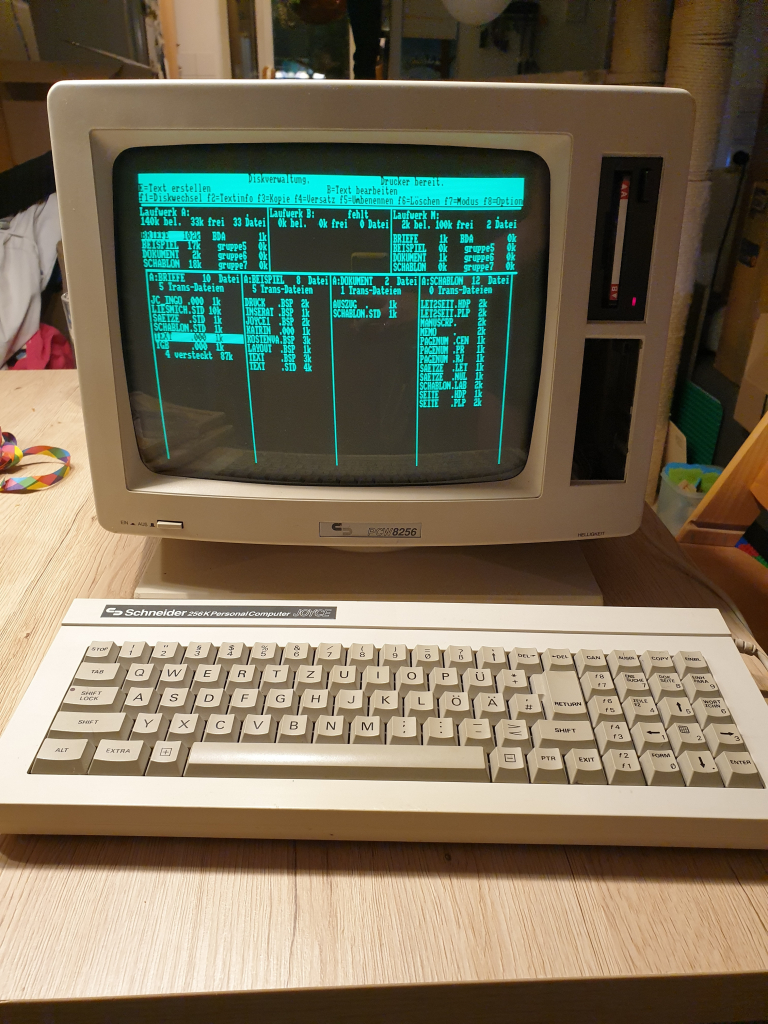 Erste Funktionstests zeigten, dass der Rechner funktioniert. Auf der mitgelieferten 3"-Diskette ist LocoScript und CPM, leider lässt sich die Diskettenseite mit CPM nicht laden. Dafür funktioniert LocoScript.