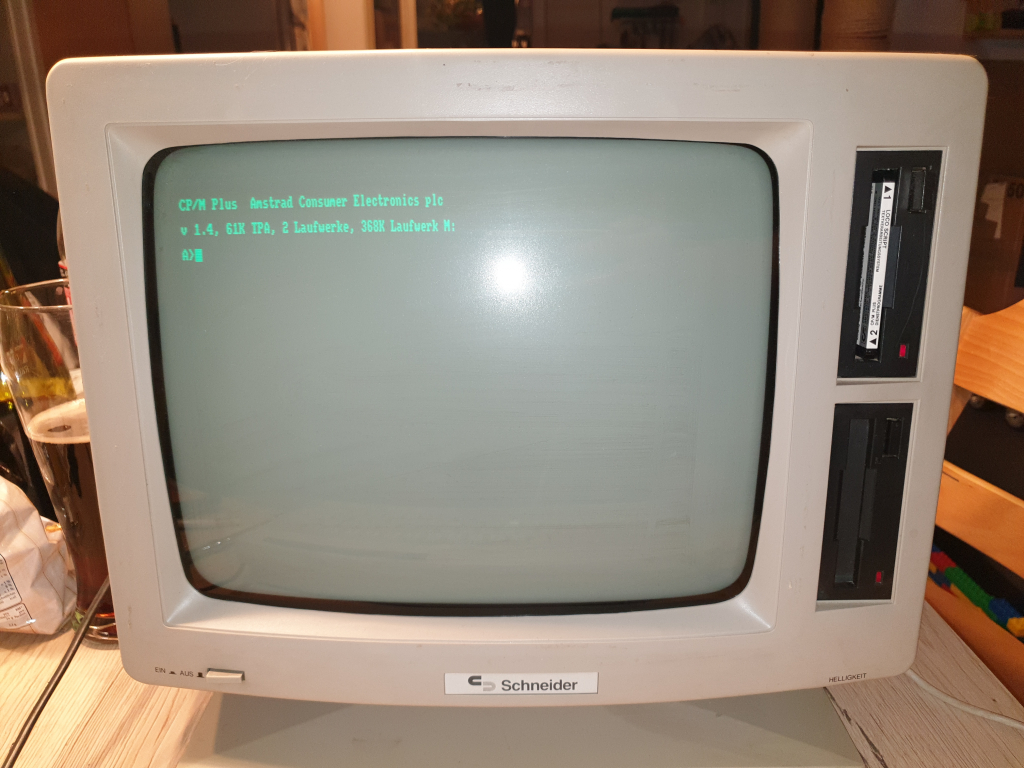 Also Startdiskette einlegen und den PCW einschalten. Der PCW hat kein Betriebssystem mit Oberfläche oder Konsole. Ohne Startdiskette zeigt der PCW nur einen grünen Bildschirm an. Recherchen im Internet besagen, dass nach einigen Minuten ein Hinweis erscheinen soll, dass keine Boot-Diskette vorhanden ist. Ich habe bisher diesen Zeitpunkt noch nicht ausgetestet. Als Startdiskette habe ich die CP/M Diskette gewählt.