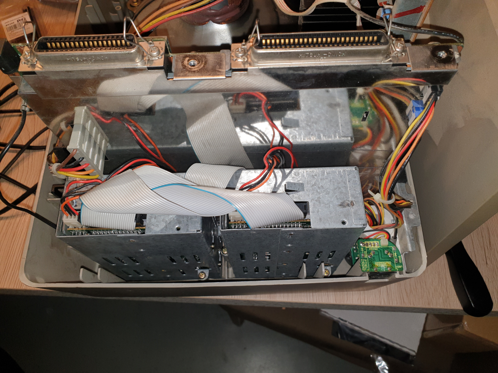 Die Laufwerke habe ich dann wieder in den PCW eingebaut. Das Metallgehäuse mit den beiden Centronics-Anschlüssen ist, sollte ich das nicht nicht erwähnt haben, der eigentliche Computer. Dahinter befindet sich schon die Bildröhre.