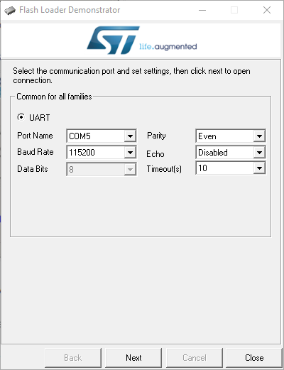 Unter Windows wird ein weiterer COM-Port angelegt. Dieser muss dann in der Flash Software ausgewählt werden. Bei mir war es COM5. Die restlichen Einstellungen sollten belassen werden.