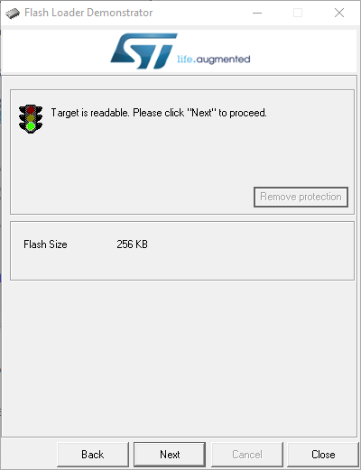 Wenn alles richtig verkabelt ist, dann sollte die Anwendung mitteilen, dass das Ziel lesbar ist und die Speichergröße des Ziels anzeigen (256kb). Beim ersten Kontaktversuch kann die Mitteilung kommen, dass es einen Schutz auf der Firmware gibt, die ein Auslesen verhindern soll. Die Flash-Software bietet dann die Funktion "Remove Protection" an. Damit wird dann auch der komplette Flashspeicher des GoTek gelöscht. Das ist auch der point of no return, danach ist der Flash-Speicher gelöscht. Diese Löschung ist nicht rückgängig zu machen. Sollte die Meldung nicht kommen, dann ist das ein Indiz dafür, dass auf dem GoTek vermutlich die Firmware schon einmal custom geflasht wurde.