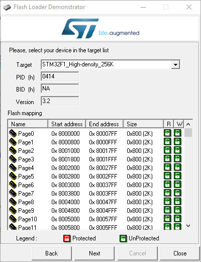 Ist der Flashspeicher leer, dann sollten die einzelnen Pages der Zielspeichers so angezeigt werden. Es sollten keine Pages geschützt sein, weder schreib- noch lesegeschützt.