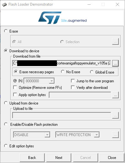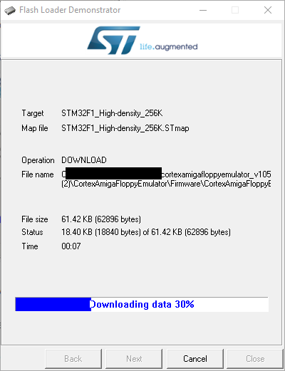 Zum Flashen der Firmware nutze ich den auf der Cortex Website vorgeschlagenen STMicroelectonics Flash loader software. Vor dem Anschluss an den PC sollte die Verbindung zwischen dem RS232 Adapter und dem GoTek hergestellt werden. Danach den PC mit dem RS232 Adapter verbinden.