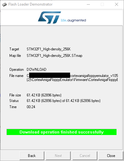 Soweiit die Theorie. Bei meinem GoTek funktionierte das Flashen des GoTek einwandfrei. Nachdem ich es an meinem AMIGA 2000 angeschlossen habe leuchtete das Segment-Display nicht. Die Power-/Lese-LED leuchtete kurz auf, aber der Selektor wurde nicht gestartet. Aktuell habe ich keine Ahnung, ob das an der Firmware liegt oder an der Hardware. Schade, bis zum eigentlichen Funktionstest hat es gut ausgesehen.