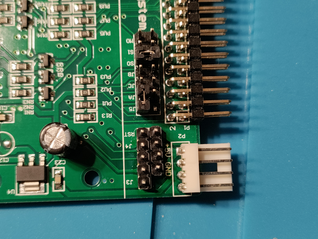 Am GoTek muss zum Flashen der Jumper Boot0 gesetzt sein. Es kann beim Flash-Prozess dazu kommen, dass das GoTek resettet werden muss. Daher die Jumperbrücke Reset. Diese muss gesetzt werden, wenn das GoTek unter Spannung steht. Manche haben das mit Pinzetten, Zangen oder Draht gemacht, da hier aber die Gefahr besteht, dass man unbeabsichtigt einen Kurzschluss auslösen kann, habe ich mich für die Stiftleiste entschieden.