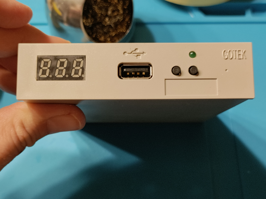 Aber dafür gibt es ja inzwischen Lösungen, nämlich Disketten-Emulatoren, an die man dann einen USB-Stick anschließen kann. Ein GoTek. Ich habe günstig eines bei AliExpress erworben - im Nachhinein bin ich mir aber nicht sicher, ob das tatsächlich ein echtes GoTek ist. Es ist ein SFRC922D Board, laut Aufdruck, aber das will bei Geräten die aus China kommen ja nichts heißen.