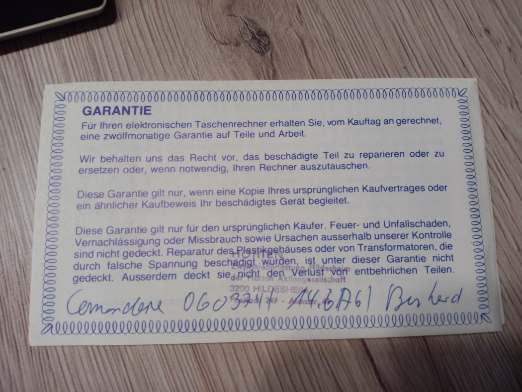Sogar der Garantieschein ist noch da und zeigt, dass der Taschenrechner am 14.06.1976 gekauft wurde und zwar bei Horten in Hildesheim. Das deckt sich auch mit dem Herstellungsjahr. Der Taschenrechner wurde in 1976 hergestellt.